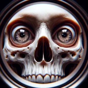 «Skull looking up at the viewer with expressive eyes through a fi...»