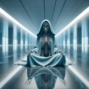 «Female skeleton wearing a soft blue hooded robe, sitting on the...»