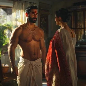 «Realistic art 1:1,a muscular beefy sweaty gujarati man doing gar...»