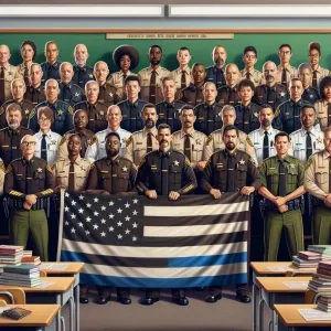 «A classroom of uniformed deputy sheriffs standing in formation,...»