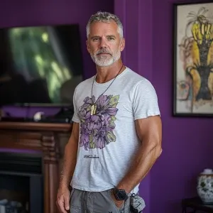 «A photograph of a bodybuilder older man with short gray hair and...»