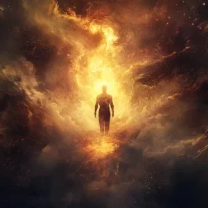 «A high-speed photography capture of a humanoid figure mid-leap,...»