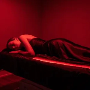 «The image shows a person standing in a dimly lit room. The indiv...»