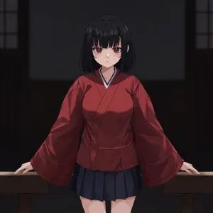 «1girl, solo, looking at viewer, bangs, skirt, black hair, standi...»