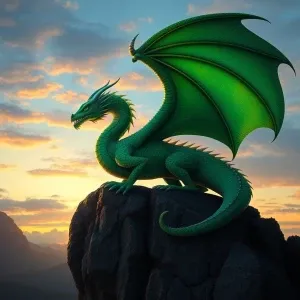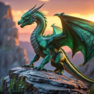 «majestic emerald-green dragon perched on a rocky cliff at sunset...»