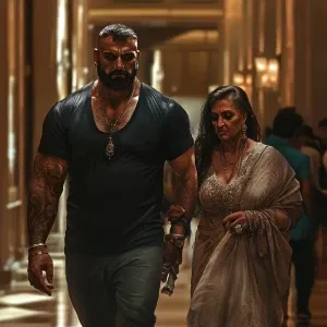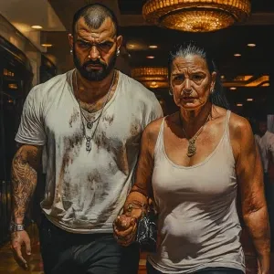 «Hyperrealism art style,a muscular beefy sweaty man walking with...»