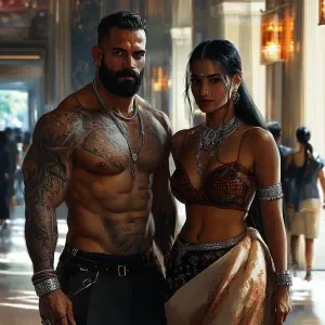 «Create a realistic art image depicting a muscular, sweaty, tatto...»