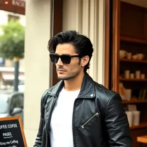 «Italian male model with wavy black hair walking into a coffee sh...»