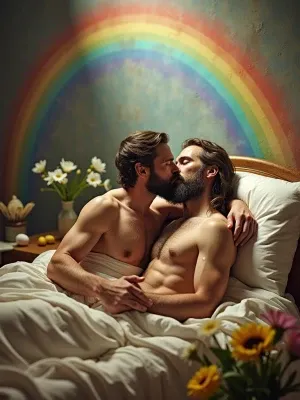 «Create an image of a shirtless Jonathan Toews affectionately kis...»