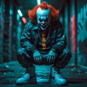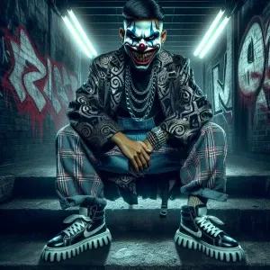 «"Create an image of a sinister clown in a trap-style outfit, com...»