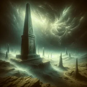 «Beneath a twisted, eldritch sky, an otherworldly obelisk looms i...»
