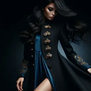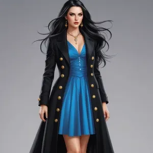 «Create an image of Bella Swan with long black hair, wearing a bl...»