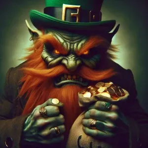 «Create an image of a sinister-looking leprechaun with an extreme...»