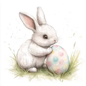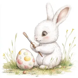 «A cute bunny sitting in a bit of grass, painting an Easter egg,...»