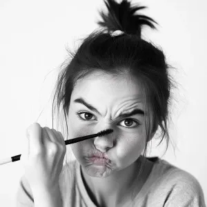 «A teenage girl with dark hair, pulled up in a ponytail, applying...»