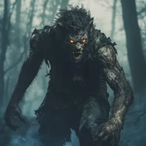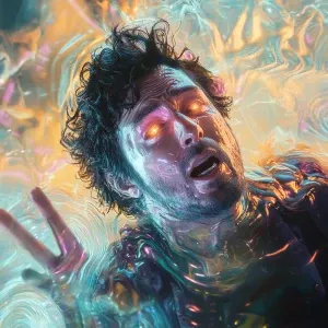«scruffy man, torn clothes, wild messy hair, glowing fierce eyes,...»