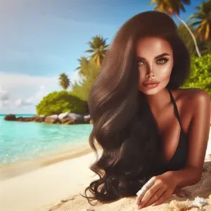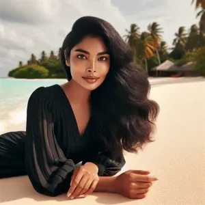 «A beautiful, curvy woman with long, luscious black hair, almond-...»