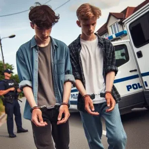 «Create an image depicting two 15-year-old white male teenagers,...»