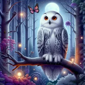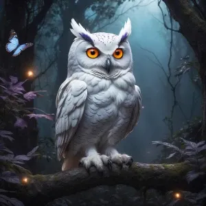 «a white owl with large orange eyes as the central focus, perched...»