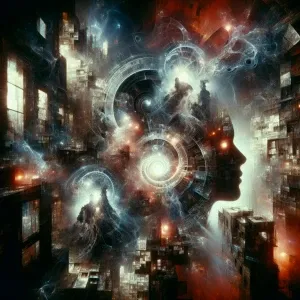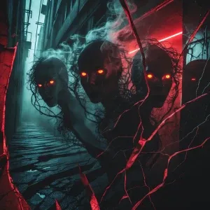 «"A surreal double-exposure composition of shadowy, faceless figu...»