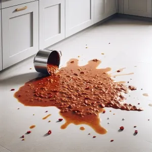«Create an image with a solid gray kitchen floor with chili spill...»