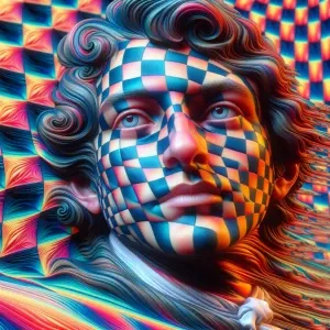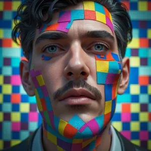 «A man's face dissolving into a colorful checkerboard texture, 3D...»