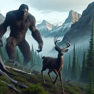 «A humanoid looking.sasquatch hunting a deer down a mountain rang...»