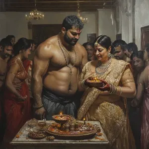 «Realism painting,A muscular, sweaty man joyously celebrates Diwa...»