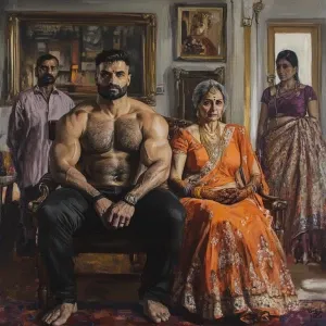 «Realistic painting 1:1,A muscular, perspiring man is in a Jaipur...»