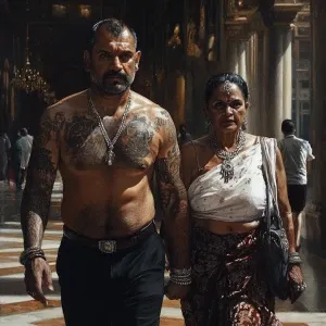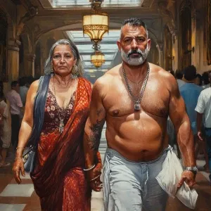 «Hyperrealistic 1:1,A sweaty beefy man walking with his 54 year o...»