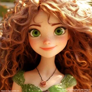 «: "Female figure with long, curly brown hair and bright green ey...»