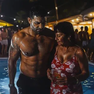 «Fantasy painting.A sweaty beefy man walking with his 54 year old...»