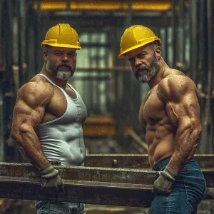 «Generate an image showing a group of muscular, tattooed construc...»