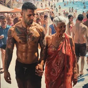 «Hyperrealistic painting.A sweaty man walking with his mother in...»